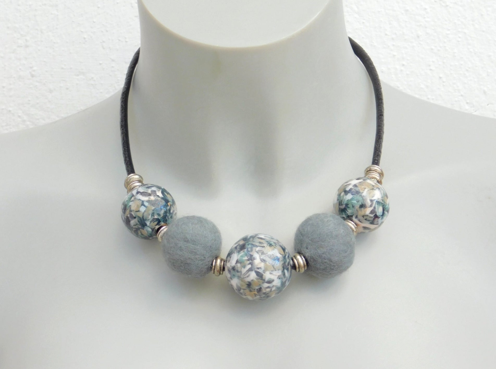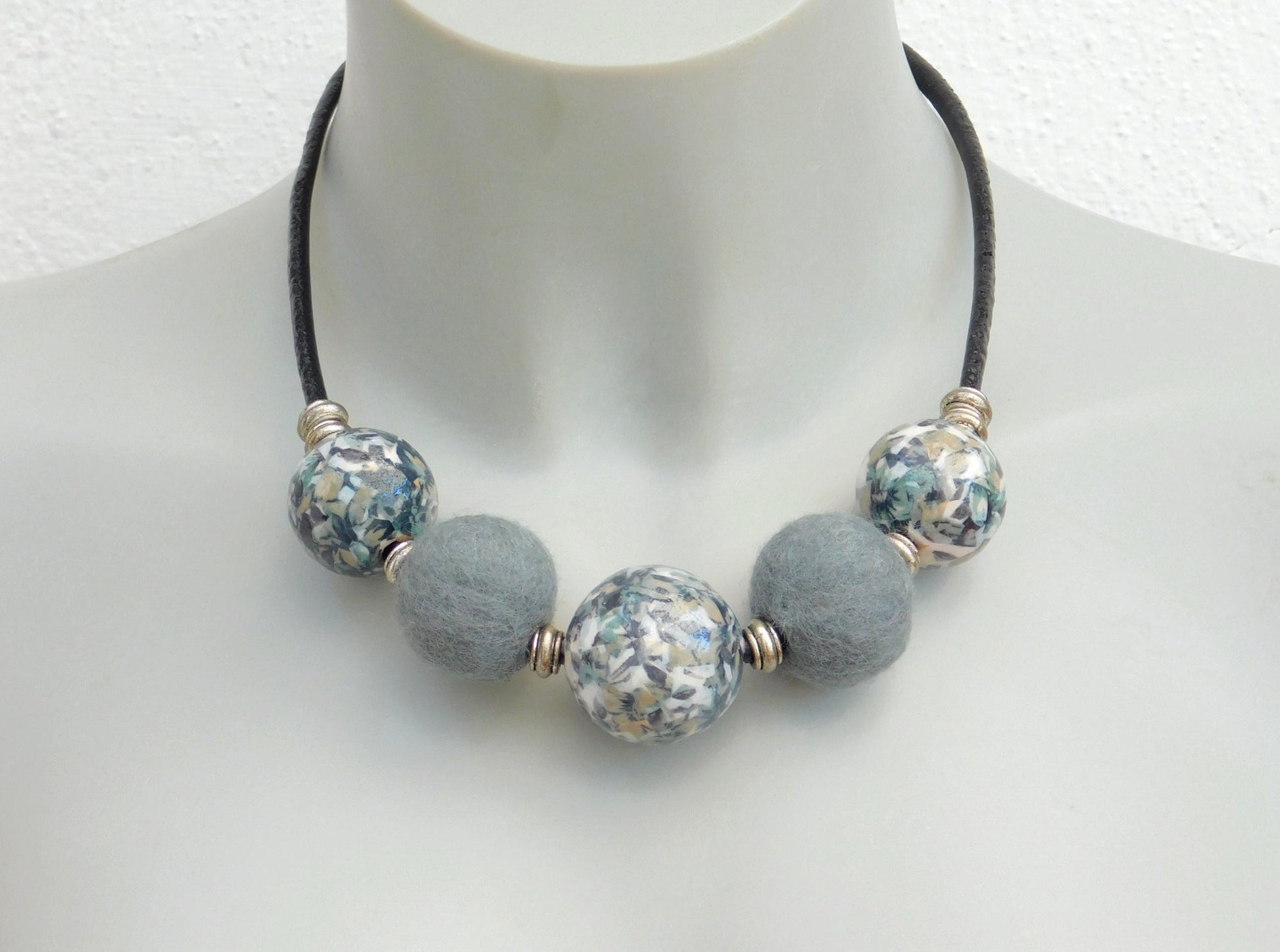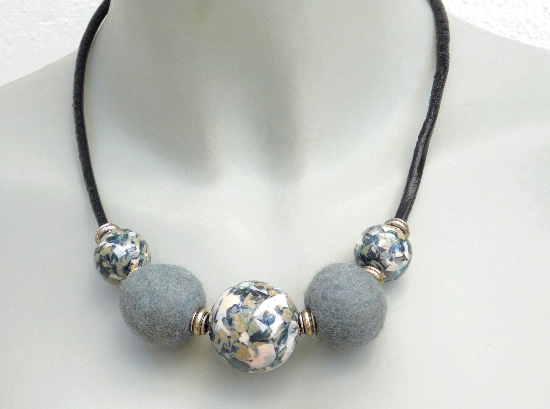 Diese Halskette besteht aus einem schwarzem Lederband und großen Kugelperlen in Grau-Weiß mit einem Muster. Auf beiden Seite der großen Kugelperle befinden sich graue Filzperlen. Am Ende der Kette gibt es weitere grau gemusterte Perlen. Die bunten Perlen sind im Decoupage-Verfahren hergestellt worden, und die Filzperle wurde von Hand gefertigt. Zwischen den Perlen befinden sich kleine, antik-silberfarbene Zwischenperlen. Die Kette wird mit einem Karabinerverschluss gesichert und hat eine 5 cm lange Verlängerungskette. Die Kette hat ein auffallendes Design und passt gut zu Strickbekleidung. Sie kombiniert handgefertigte Elemente wie die Filzperle mit kunstvoll gestalteten Decoupage-Perlen und verleiht Ihrem Outfit einen einzigartigen Touch.