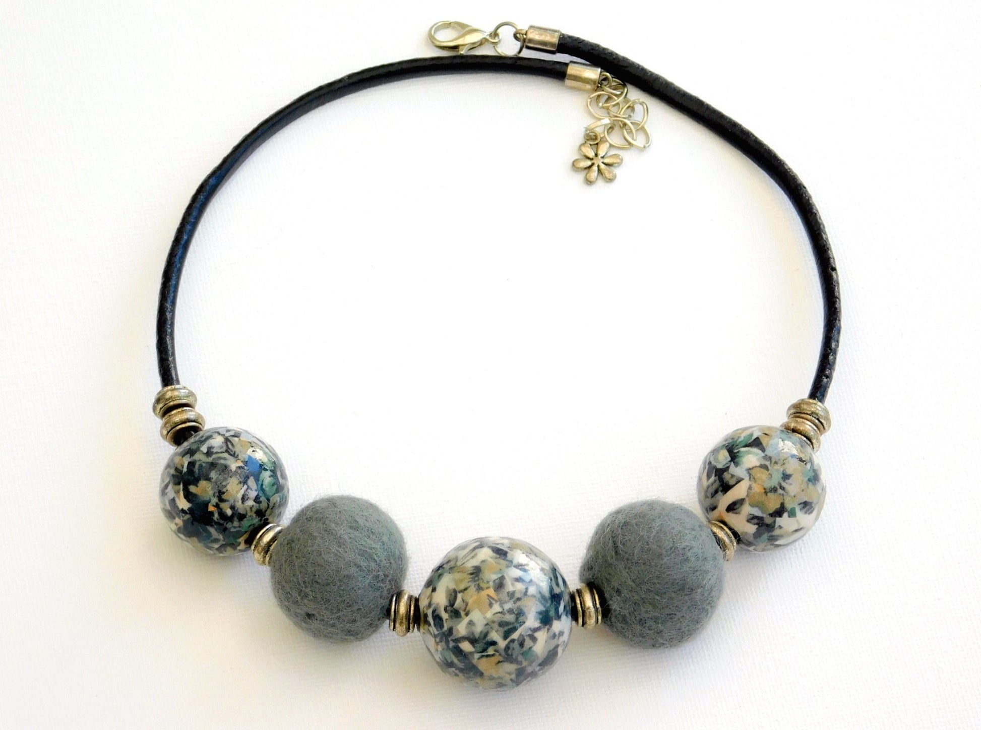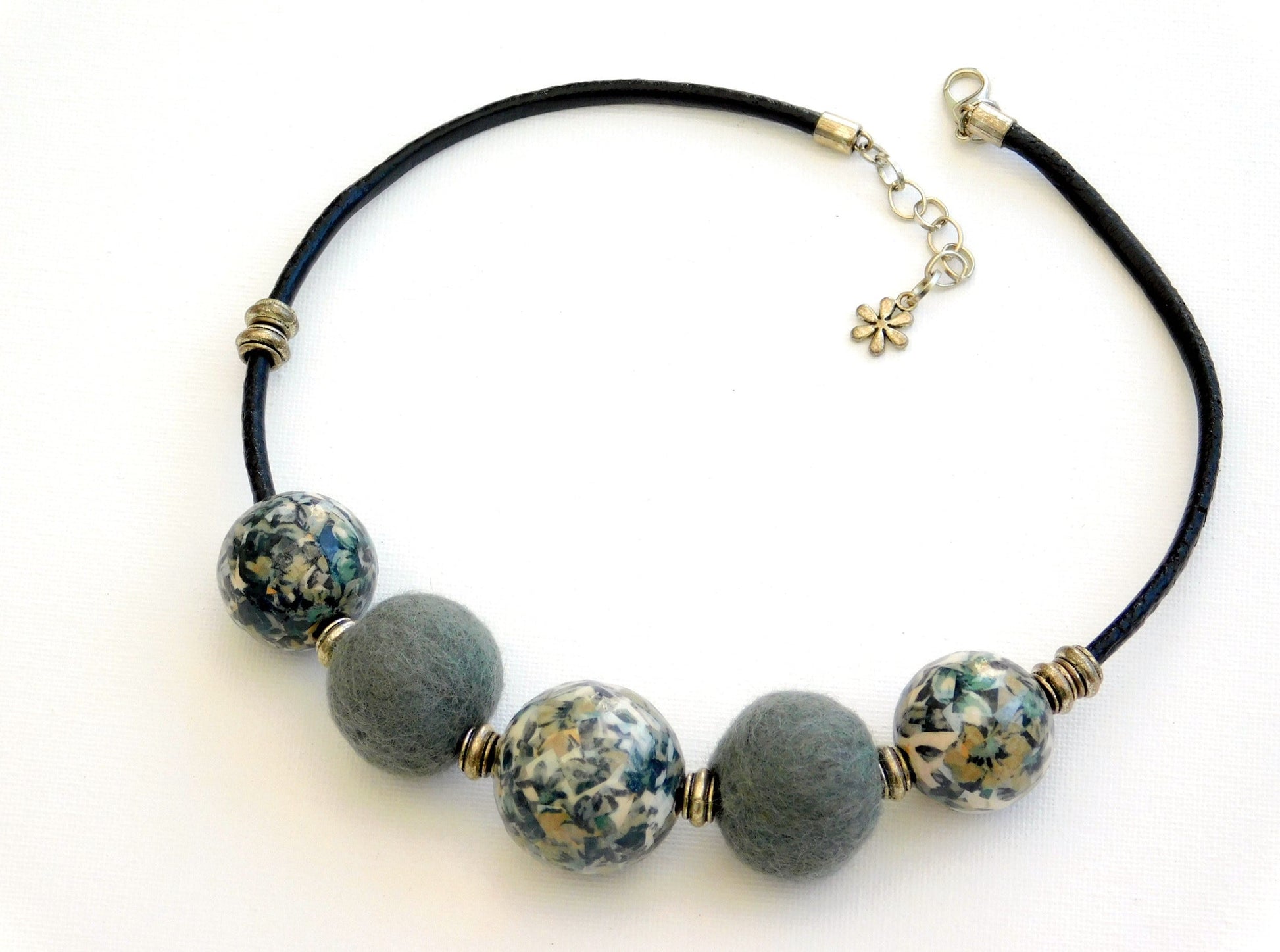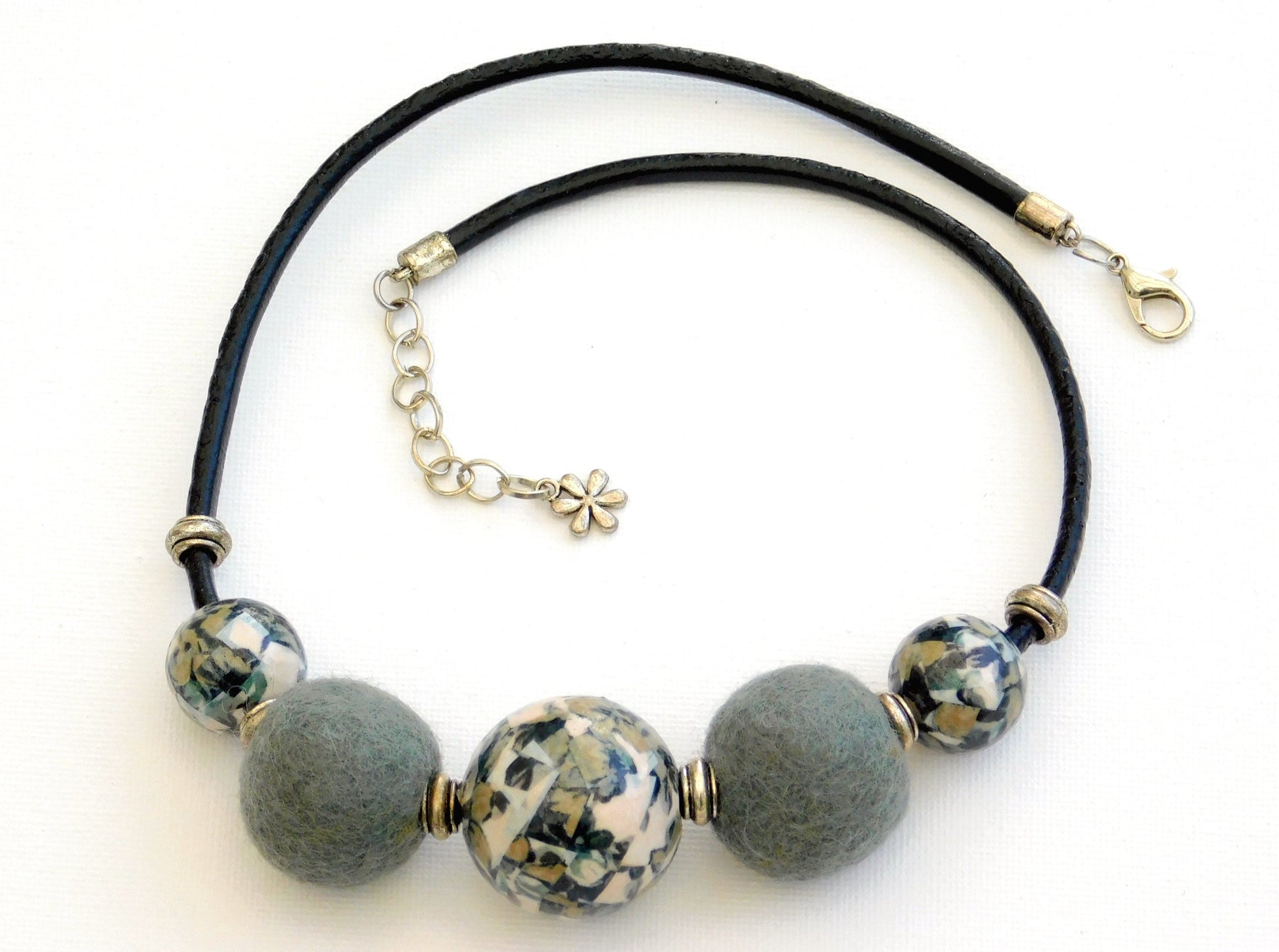 Diese Halskette besteht aus einem schwarzem Lederband und großen Kugelperlen in Grau-Weiß mit einem Muster. Auf beiden Seite der großen Kugelperle befinden sich graue Filzperlen. Am Ende der Kette gibt es weitere grau gemusterte Perlen. Die bunten Perlen sind im Decoupage-Verfahren hergestellt worden, und die Filzperle wurde von Hand gefertigt. Zwischen den Perlen befinden sich kleine, antik-silberfarbene Zwischenperlen. Die Kette wird mit einem Karabinerverschluss gesichert und hat eine 5 cm lange Verlängerungskette. Die Kette hat ein auffallendes Design und passt gut zu Strickbekleidung. Sie kombiniert handgefertigte Elemente wie die Filzperle mit kunstvoll gestalteten Decoupage-Perlen und verleiht Ihrem Outfit einen einzigartigen Touch.